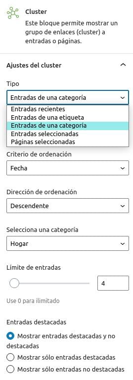 En este post podrías ver los diferentes estilos del bloque cluster de entradas o páginas de Wasabi Theme. También verás cómo se puede configurar por posts seleccionados manualmente, por posts recientes o de la misma categoría o etiqueta. Lo mismo se puede hacer para páginas.